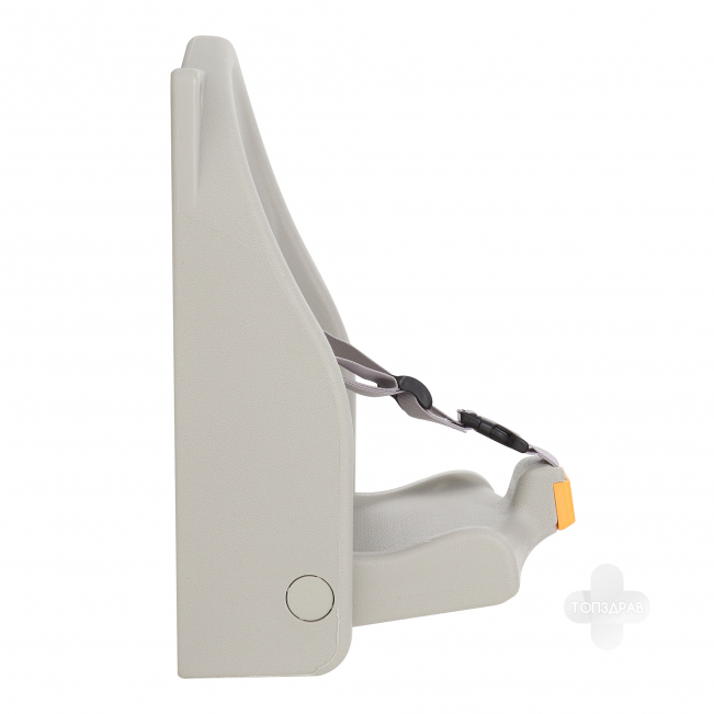 Материалом для сидения и спинки служит прочный пластик. Он не деформируется и не трескается. Модель имеет откидное сидение, а также специальные ремни безопасности. Они также выполнены материалов, не вызывающих аллергии или телесного дискомфорта. Модель отличается достаточно компактными размерами, что позволит использовать его даже там, где нужно рационально использовать пространство. Кресло крепится к стене. Его легко чистить и мыть благодаря гладкой поверхности, отсутствию лишних деталей. Также модель можно обрабатывать дезинфицирующими средствами.